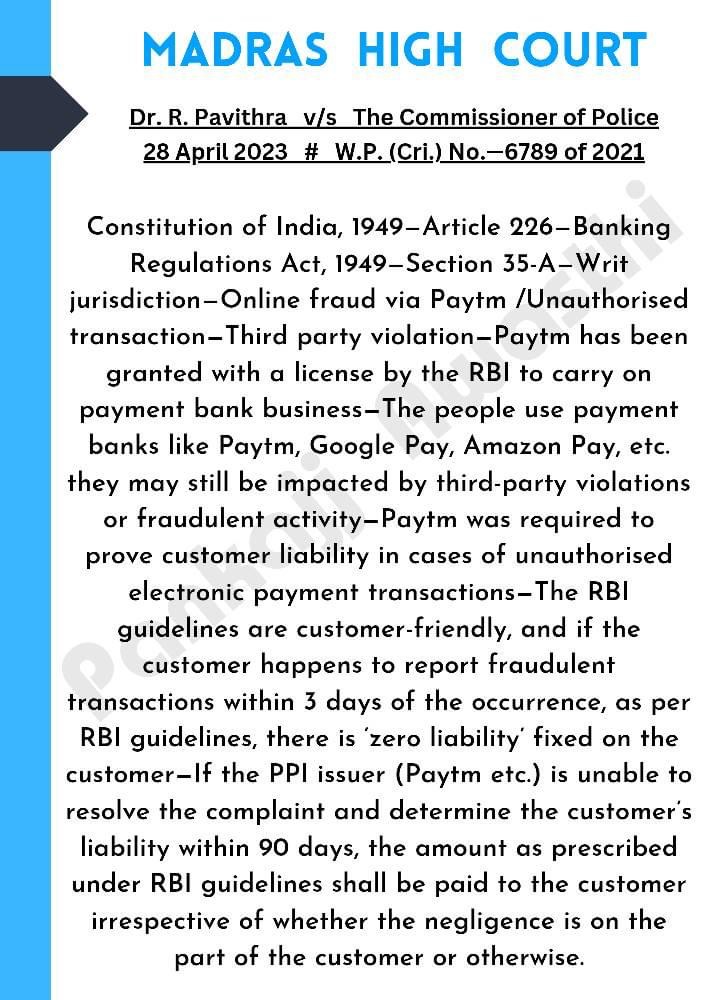 अनाधिकृत धन-निकासी—जनता पेटीएम, गूगल पे, एमेज़ॉन पे आदि जैसे भुगतान माध्यमों का उपयोग करते हैं तो वे भी तीसरे पक्ष (हैकर्स) द्वारा धोखाधड़ी की गतिविधि से प्रभावित हो सकते हैं—पेटीएम द्वारा अनाधिकृत धन-निकासी के मामलों में उपभोक्ता की गलती साबित करना आवश्यक है—रिज़र्व बैंक ऑफ इण्डिया के दिशा-निर्देश ग्राहकों के अनुकूल हैं और यदि ग्राहक घटना के 3 दिनों के भीतर धोखाधड़ी वाले अनाधिकृत धन-निकासी की रिपोर्ट करता है, तो आर०बी०आई० दिशा-निर्देशों के अनुसार, ग्राहक को ज़िम्मेदार नहीं ठहराया जा सकता है—यदि पी०पी०आई० जारीकर्ता (पेटीएम आदि) ग्राहक द्वारा धन-निकासी की शिकायत का समाधान करने और 90 दिनों के भीतर ग्राहक की देयता निर्धारित करने में असमर्थ है, तो आर०बी०आई० दिशा-निर्देशों के तहत निर्धारित राशि का भुगतान ग्राहक को किया जाएगा, भले ही लापरवाही ग्राहक की ओर से हो या ना हो।