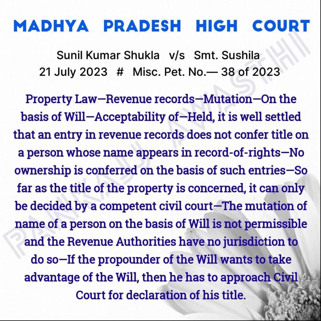वसीयत के आधार पर राजस्व-अभिलेखों में दाख़िल-ख़ारिज की प्रक्रिया नहीं अपनाई जा सकती है—वसीयत के हितबद्ध व्यक्ति (Propounder of Will) को यदि वसीयत का लाभ अभिप्राप्त करना है तो सिविल न्यायालय ही एकमात्र विकल्प है—वसीयतशुदा संपत्ति के आधार पर मालिकाना हक़ का निर्धारण सिर्फ सिविल न्यायालय ही कर सकता है—राजस्व-अधिकारियों को ऐसा कोई क्षेत्राधिकार प्राप्त नहीं है।