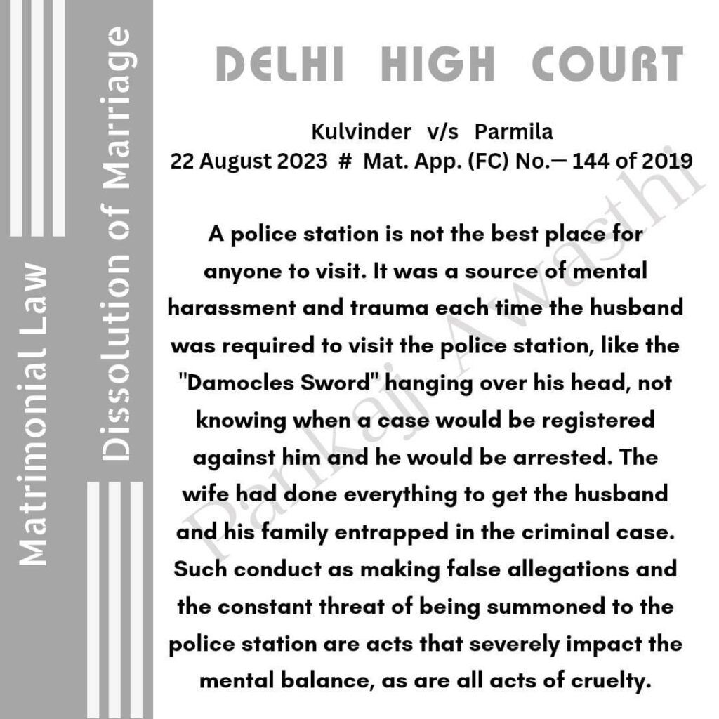 पुलिस स्टेशन किसी भी व्यक्ति के विज़िट के लिए अच्छा स्थान नहीं है। हर बार जब पति को पुलिस स्टेशन जाना पड़ता था, तो यह मानसिक उत्पीड़न और आघात के समान होता था, जैसे कि कब उसके खिलाफ कोई मामला दर्ज कर लिया जाएगा और वह गिरफ्तार हो जाएगा। पत्नी ने पति और उसके परिवार को आपराधिक मामले में फँसाने के लिए सब कुछ किया था। पति पर झूठे आरोप लगाना और पुलिस स्टेशन में तलब किए जाने की लगातार धमकी मानसिक क्रूरता के ऐसे कृत्य हैं जो पति के मानसिक संतुलन को गंभीर रूप से प्रभावित करते हैं।