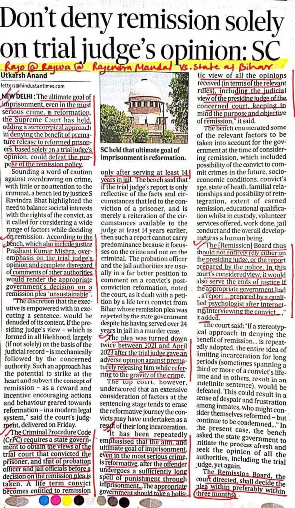 The Supreme Court recently pronounced a notable judgment explaining the factors which a Government should take into account while deciding to grant remission of sentence to convicts as per Section 432 of the Code of Criminal Procedure.