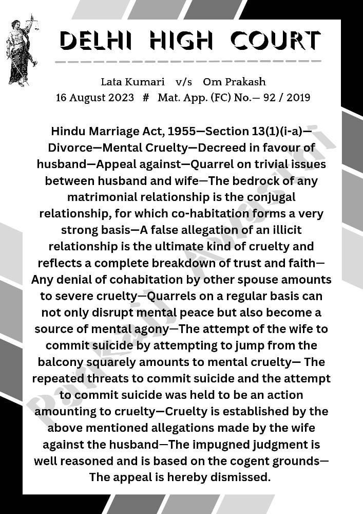 किसी भी विवाह का मजबूत आधार वैवाहिक संबंध होता है, जिसके लिए सहवास एक बहुत मजबूत आधार है—अवैध संबंध का झूठा आरोप उच्चकोटि की क्रूरता है और पति-पत्नी के बीच विश्वास के समाप्त होने को दर्शाता है—इसके अतिरिक्त पति या पत्नी द्वारा सहवास से इनकार करना गंभीर क्रूरता के समान है—दाम्पत्य जीवन में नियमित रूप से झगड़े न केवल मानसिक शांति को बाधित कर सकते हैं बल्कि मानसिक पीड़ा का स्रोत भी बन सकते हैं—इसके अतिरिक्त पत्नी द्वारा निरन्तर आत्महत्या का प्रयास करना भी स्पष्ट रूप से मानसिक क्रूरता है।