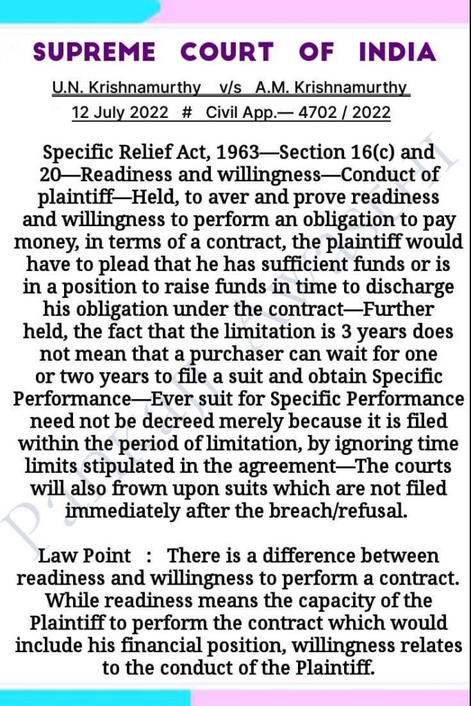 विनिर्दिष्ट अनुतोष अधिनियम, 1963—धारा 16(c) एवं 20—संविदा का विशिष्ट अनुपालन—निर्णीत, संविदा के विशिष्ट अनुपालन के लिए वादी को संविदा को पूर्ण करने की तत्परता के साथ-साथ ये भी साबित करना है संविदा के निर्वहन करने के लिए वह तयशुदा और निर्धारित समय पर धन जुटाने की स्थिति में है—भले ही संविदा के विशिष्ट अनुपालन के लिए वाद दायर करने की समयावधि 3 वर्ष है लेकिन इसका ये तात्पर्य नहीं है कि वादी दावा दायर करने के लिए 1 या 2 साल तक प्रतीक्षा करता रहे।