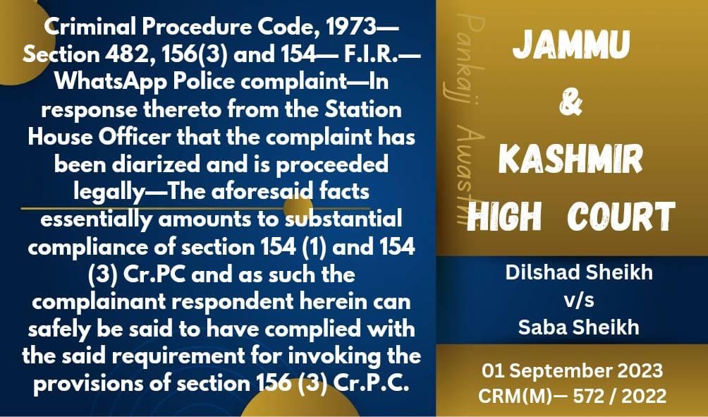 पीड़िता द्वारा व्हाट्सएप के माध्यम से पुलिस को अपराध की सूचना दी गई—पुलिस थाने के भारसाधक अधिकारी द्वारा सूचना को स्टेशन डायरी में अंकित कर विधि अनुसार कार्रवाई प्रारंभ की गई—ऐसी सूचना धारा 154(1) की अर्हताओं को पूरा करती है।