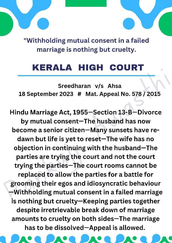 Beena M.S. v/s Shino G. Babu, [2022 (2) KHC 11]—”The law on divorce recognises both fault and consent as a cause for separation. When both the parties are unable to lead a meaningful matrimonial life due to inherent differences of opinion and one party is willing for separation and the other party is withholding consent for mutual separation, that itself would cause mental agony and cruelty to the spouse who demands separation.”