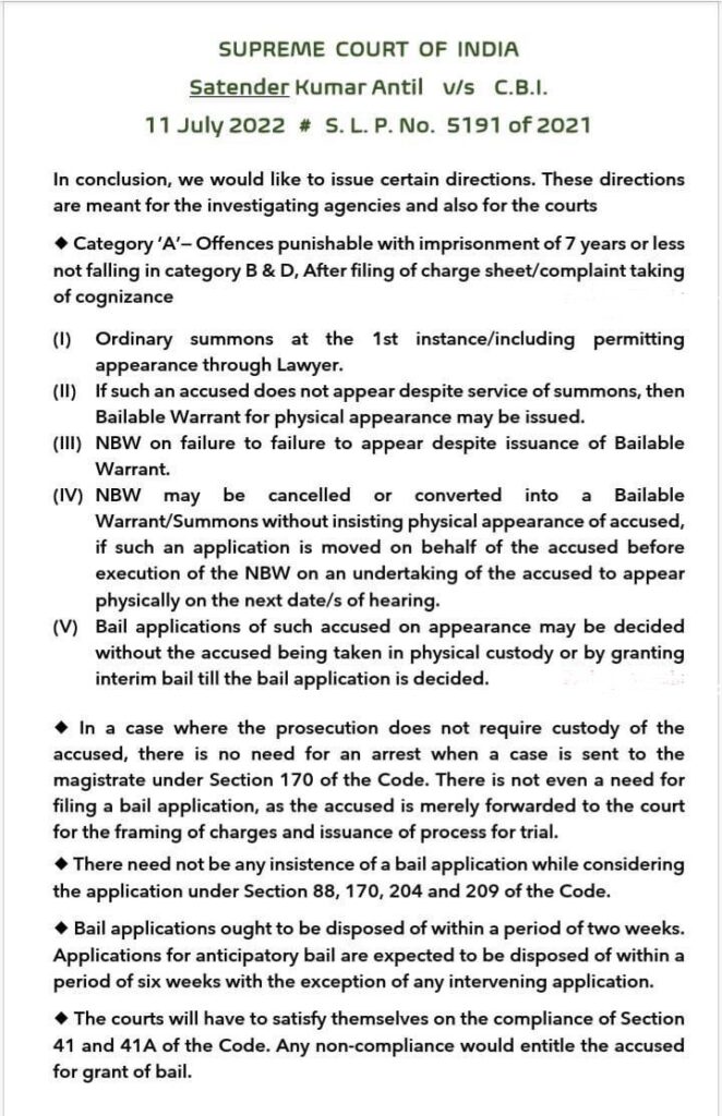 ◆ ज़मानत प्रार्थना-पत्र को दो सप्ताह में तथा अग्रिम जमानत याचिका (Anticipatory Bail) को 6 सप्ताह के अन्दर निस्तारित किया जाएगा।
