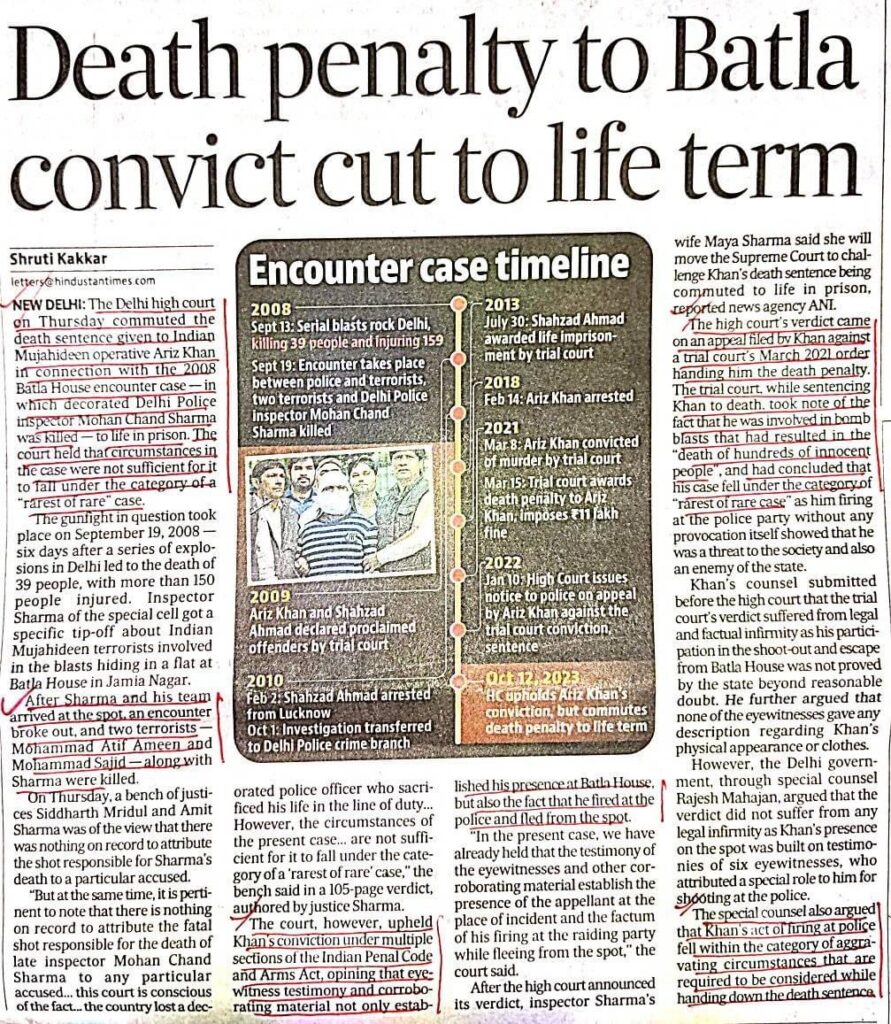 The Delhi High Court on Thursday refused to confirm the death penalty awarded to Ariz Khan, who was convicted by a trial court in the 2008 Batla house encounter case in which Delhi Police’s inspector Mohan Chand Sharma was killed.