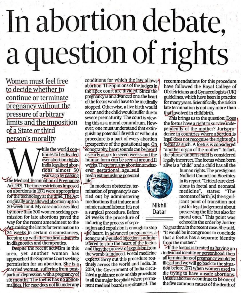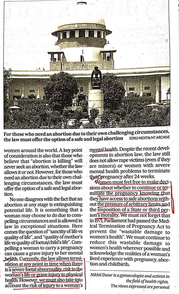Women must feel free to decide whether to continue or terminate pregnancy without the pressure of arbitrary limits and the imposition of a State or third person’s morality. Leave a Comment / Uncategorized / By admin_nupur Share 0 Post 0 Share Whatsapp 0Shares
