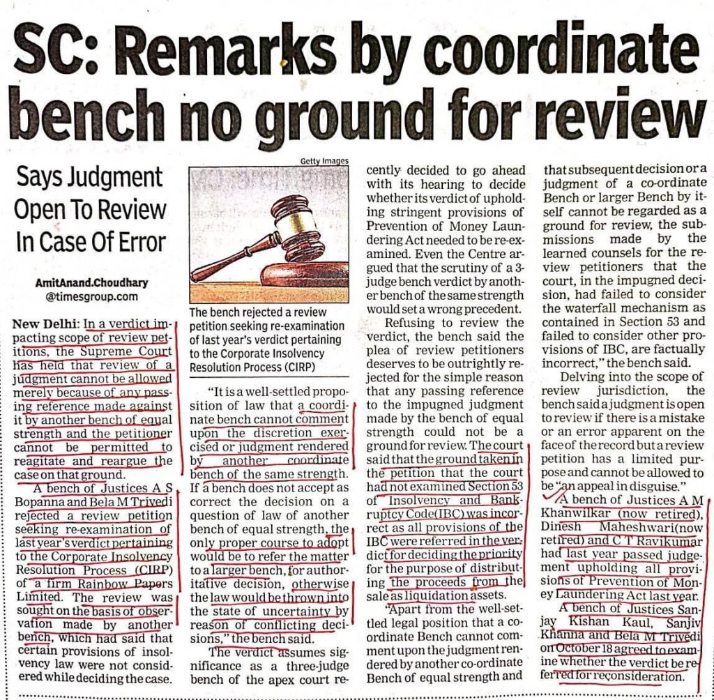 A coordinate bench cannot comment upon the discretion exercised or judgment rendered by another coordinate bench of the same strength.
