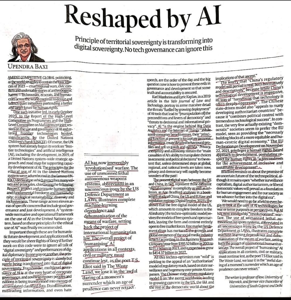 Reshaped by Artificial Intelligence: Principle of territorial sovereignty is transforming into digital sovereignty.No tech governance can ignore this.