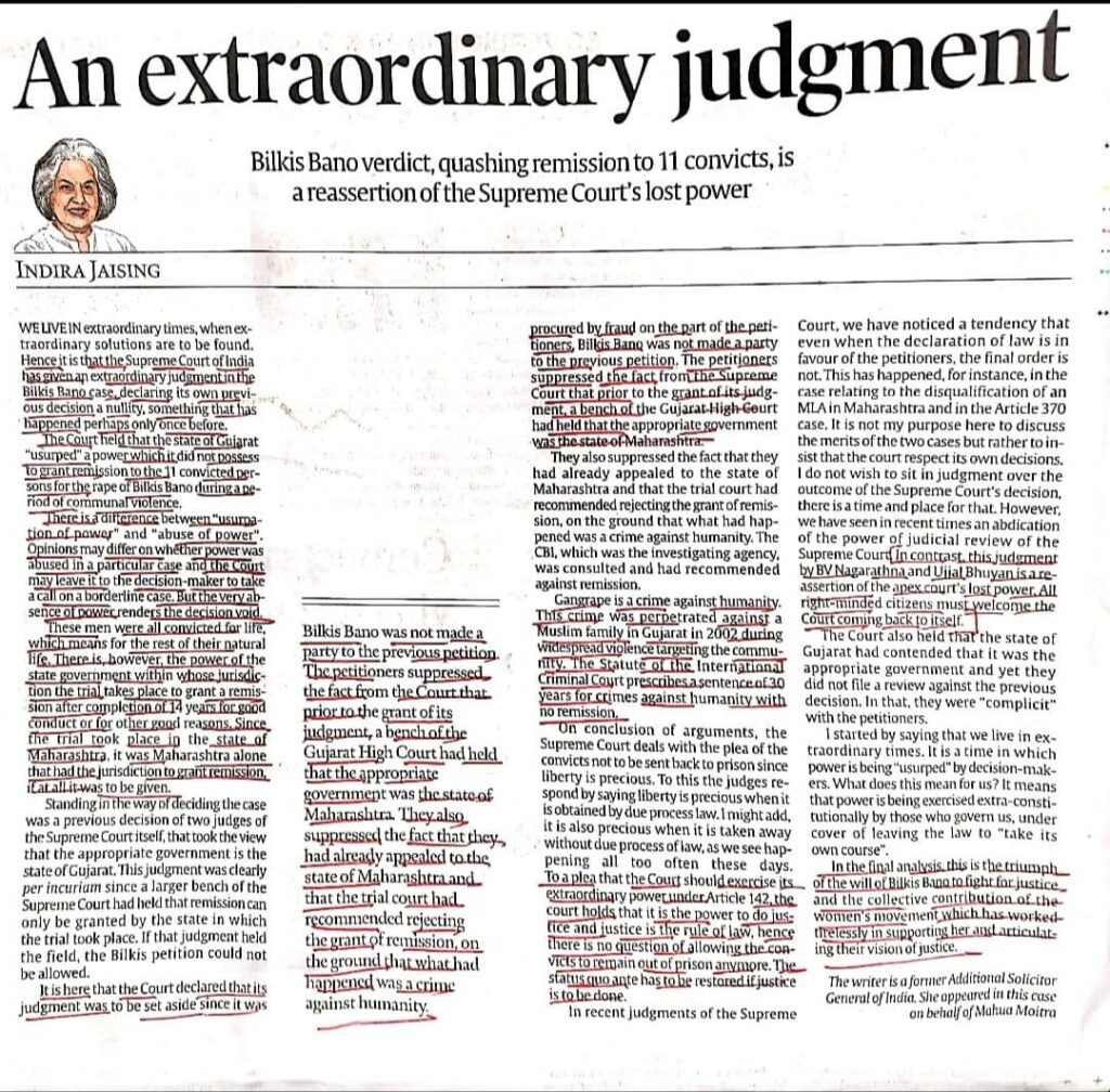 An extraordinary judgement. Bilkis Bano verdict, quashing remission to 11 convicts,is a reassertion of the Supreme Court’s lost power.