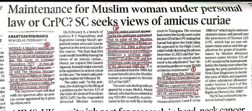 Legal News…Maintenance for Muslim Woman under personal law or CrPC? Supreme Court seeks views of Amicus Curiae. Leave a Comment / Uncategorized / By admin_nupur Share 0 Post 0 Share Whatsapp 0Shares