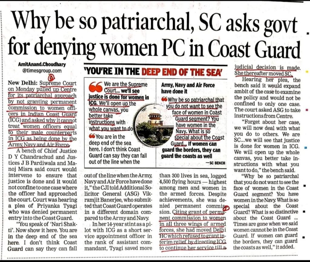 Legal News…Why be so patriarchal, Supreme Court asks government for denying women Permanent Commission in Coast Guard. Leave a Comment / Uncategorized / By admin_nupur Share 0 Post 0 Share Whatsapp 0Shares