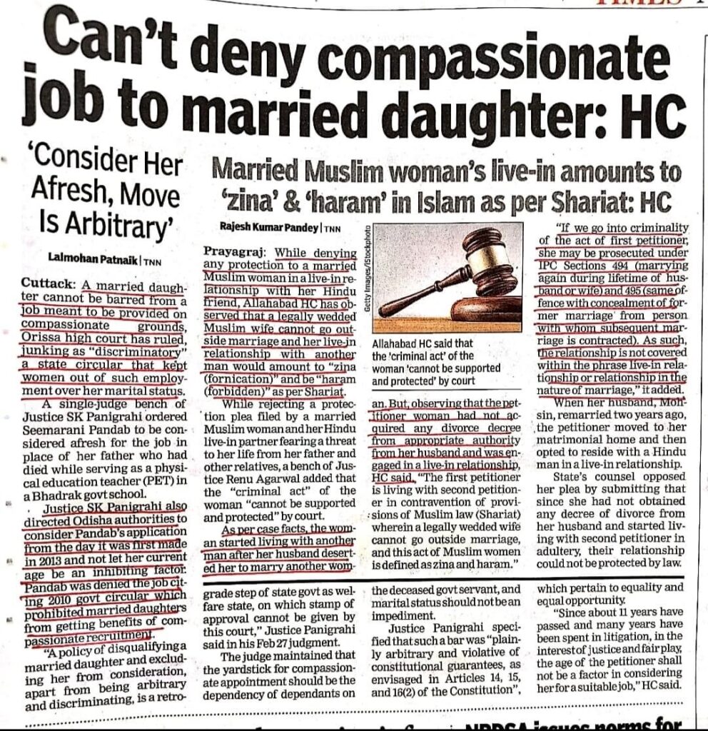 Legal News…Can’t deny compassionate job to married daughter: Orissa High Court and Married Muslim woman’s live-in relationship amounts to ‘zina’ and ‘haram’ in Islam as per Shariat: Allahabad High Court. Leave a Comment / Uncategorized / By admin_nupur Share 0 Post 0 Share Whatsapp 0Shares