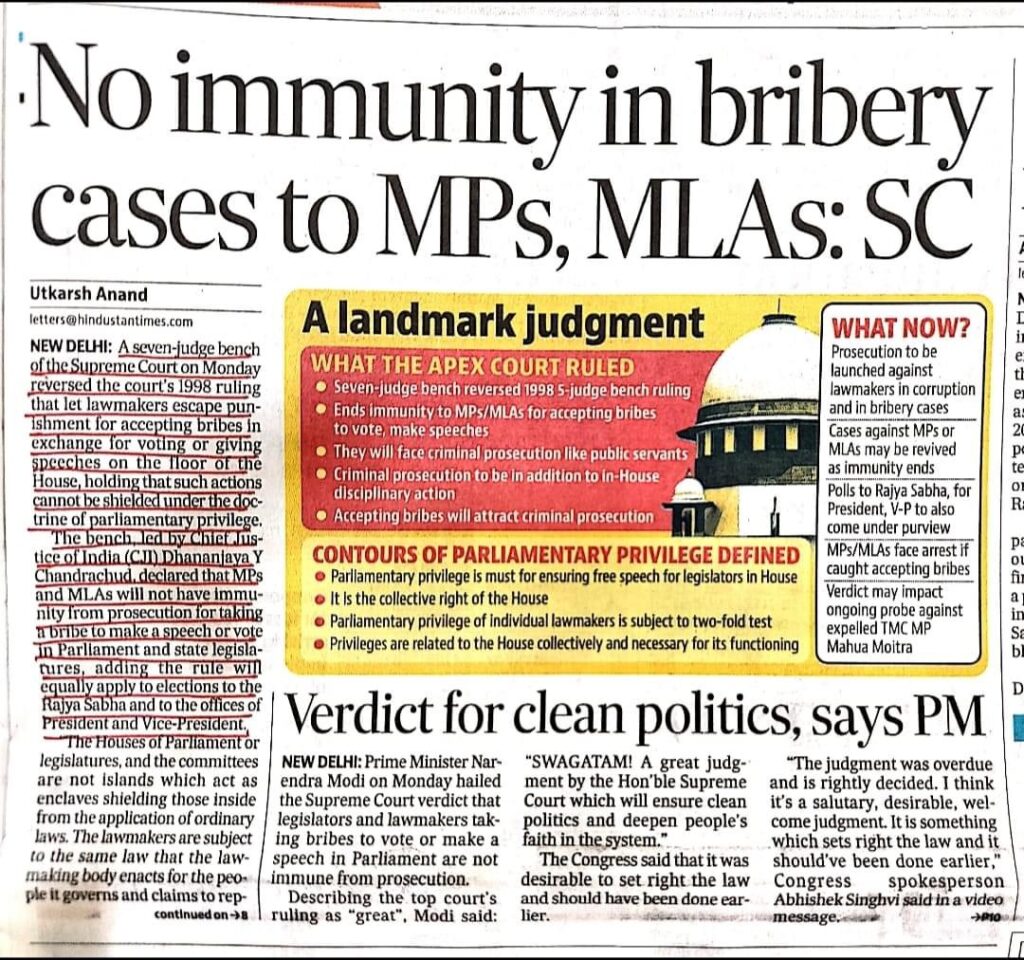 Legal News…No immunity in bribery cases to MPs,MLAs: Supreme Court. Leave a Comment / Uncategorized / By admin_nupur Share 0 Post 0 Share Whatsapp 0Shares
