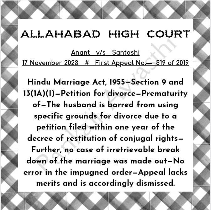 Legal Facts..*धारा 9—दाम्पत्य संबंधों की पुनर्स्थापना के मुकद्दमे के निर्णय के एक वर्ष व्यतीत हो जाने के पश्चात ही विवाह-विच्छेद याचिका प्रस्तुत की जा सकती है, उससे पूर्व नहीं।… Leave a Comment / Uncategorized / By admin_nupur Share 0 Post 0 Share Whatsapp 0Shares