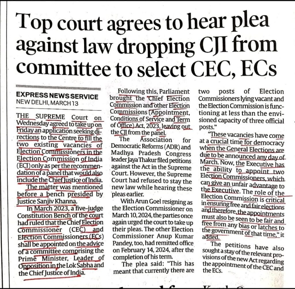 Legal News..Supreme Court agree to hear pleas against law dropping CJI from committee to select Chief Election Commissioner and Election Commissioner. Leave a Comment / Uncategorized / By admin_nupur Share 0 Post 0 Share Whatsapp 0Shares