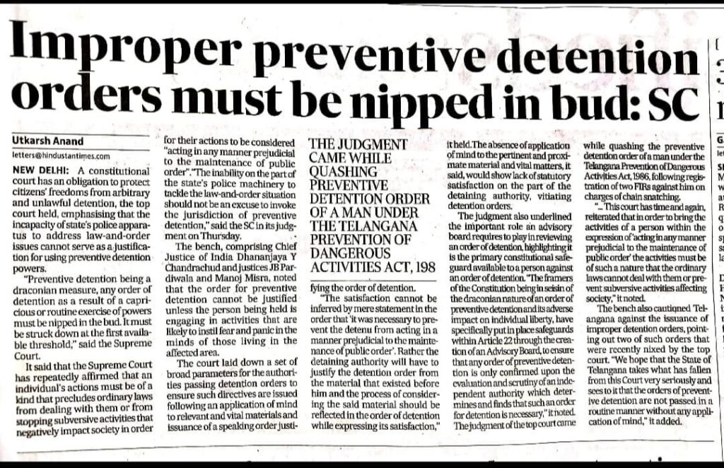 Legal News..Improper preventive detention orders must be nipped in bud: Supreme Court… Leave a Comment / Uncategorized / By admin_nupur Share 0 Post 0 Share Whatsapp 0Shares