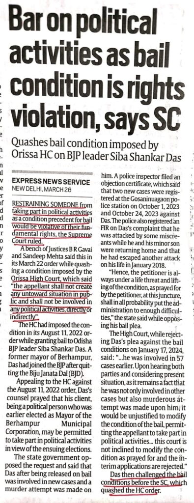 Legal News..Bar on political activities as bail condition is rights violation: Supreme Court… Leave a Comment / Uncategorized / By admin_nupur Share 0 Post 0 Share Whatsapp 0Shares
