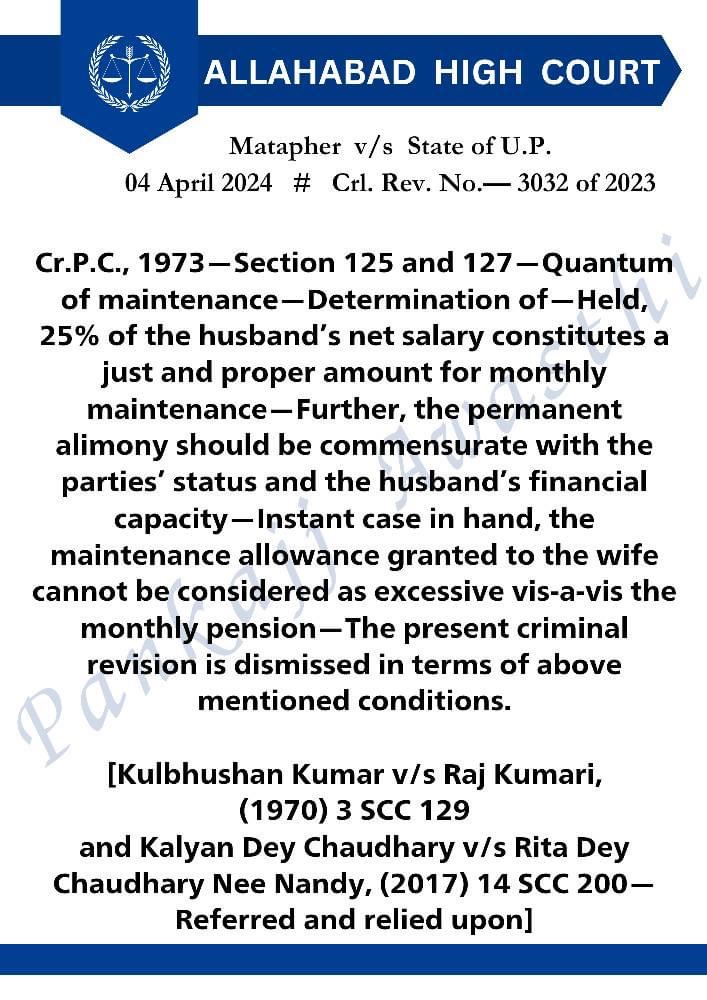 Legal Update..पति की शुद्ध-आय (Net salary) का 25% पत्नी को भरण-पोषण के रूप में अदा किया जाना उपयुक्त है।… Leave a Comment / Uncategorized / By admin_nupur Share 0 Post 0 Share Whatsapp 0Shares