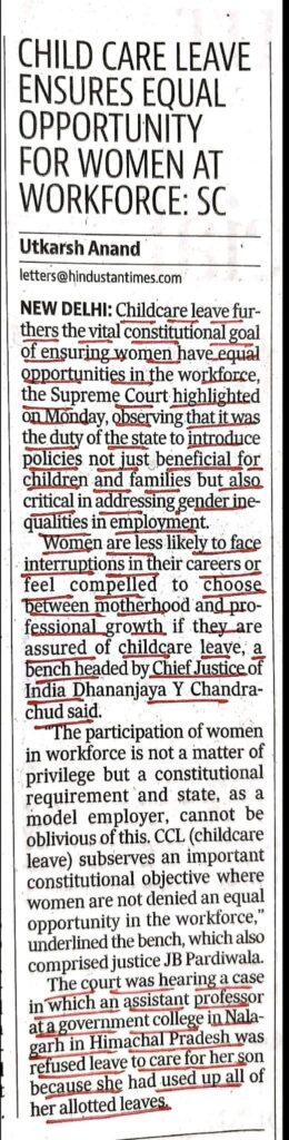 Legal Update..Child Care Leave Ensures Equal Opportunity For Women At Workforce: Supreme Court… Leave a Comment / Uncategorized / By admin_nupur Share 0 Post 0 Share Whatsapp 0Shares