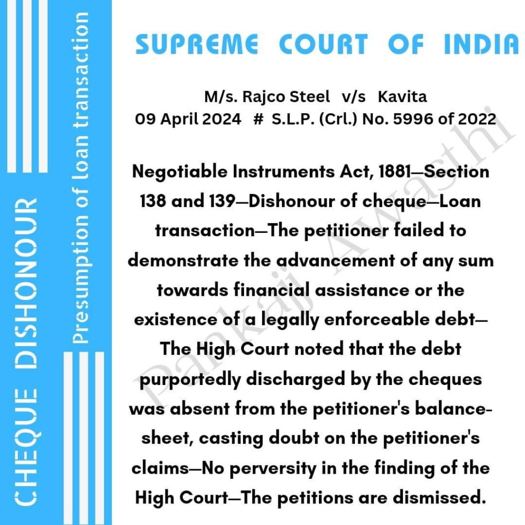 Legal Update..NI Act Sec. 138 and 139..SLP. (Crl.) No. 5996 of 2022… Leave a Comment / Uncategorized / By admin_nupur Share 0 Post 0 Share Whatsapp 0Shares