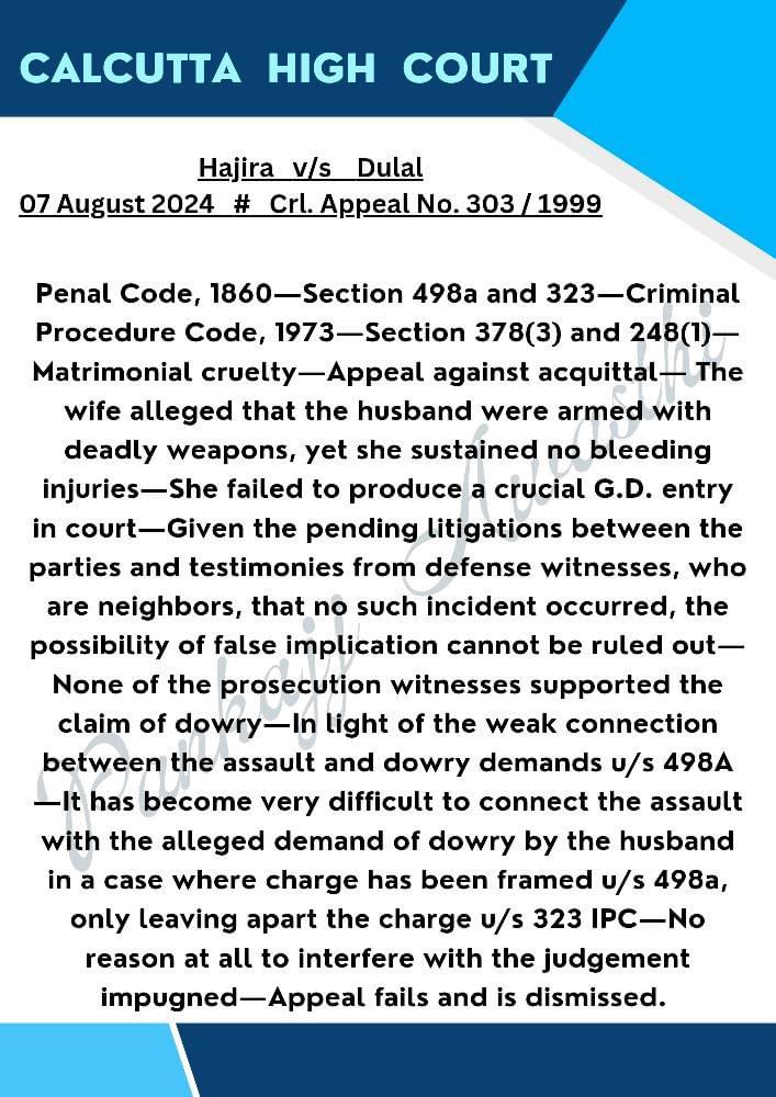 धारा 498-क—दोष-मुक्ति के विरुद्ध अपील—पत्नी ने आरोप लगाया कि पति घातक हथियारों से लैस थे, फिर भी उसे कोई रक्त बहने वाली चोट नहीं—पत्नी न्यायालय में इस घटना की एक महत्वपूर्ण जी.डी. प्रविष्टि प्रस्तुत करने में विफल रही—पक्षकारों के बीच लंबित मुकदमों और बचाव पक्ष के गवाहान, जो कि पड़ोसी हैं, को देखते हुए पत्नी द्वारा पति को झूठे फंसाने की संभावना को खारिज नहीं किया जा सकता है—अभियोजन पक्ष के किसी भी गवाह ने दहेज की माँग के दावे का समर्थन नहीं किया—आक्षेपित निर्णय में हस्तक्षेप करने का कोई कारण नहीं है—अपील विफल—अतः खारिज