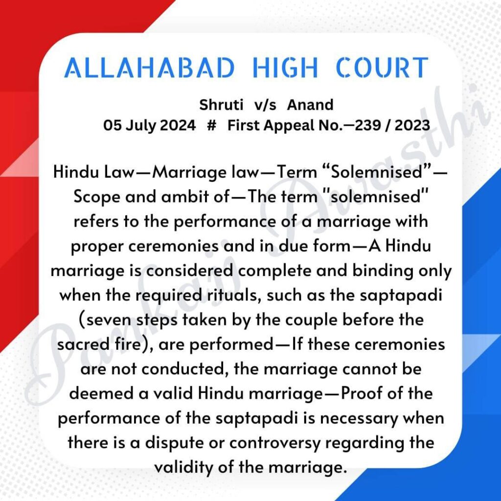 शब्द ‘संपन्न’ का अर्थ विवाह को उचित रीति रिवाजों और विधि पूर्वक संपन्न करना है—जब तक विवाह उचित रीति रिवाजों और विधि पूर्वक संपन्न नहीं हो जाता, तब तक इसे ‘संपन्न’ नहीं कहा जा सकता—सप्तपदी, अर्थात् दूल्हा और दुल्हन द्वारा पवित्र अग्नि के समक्ष सातवाँ फेरा लेने से ही विवाह पूर्ण और बाध्यकारी होता है—जब कोई हिंदू विवाह लागू रीति-रिवाजों या संस्कारों, जैसे सप्तपदी, के अनुसार संपन्न नहीं होता है, तो उस विवाह को हिंदू विवाह नहीं माना जाएगा।