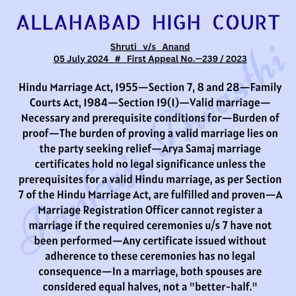 वैध हिन्दू विवाह को साबित करने का भार उस पक्ष पर है जो रिलीफ मांगने के लिए न्यायालय आता है—आर्य समाज विवाह प्रमाण-पत्र का कोई कानूनी महत्व नहीं होता है जब तक कि हिंदू विवाह अधिनियम की धारा 7 के अनुसार वैध हिंदू विवाह की आवश्यक शर्तें पूरी नहीं हो जाती और साबित नहीं हो जाती—विवाह पंजीकरण अधिकारी धारा 7 के तहत आवश्यक संस्कारों के बिना संपन्न हुए विवाह का पंजीकरण नहीं कर सकता—इन संस्कारों के पूर्ण हुए बिना जारी किया गया कोई भी वैवाहिक प्रमाण पत्र कानूनी बाध्यता नहीं रखता है