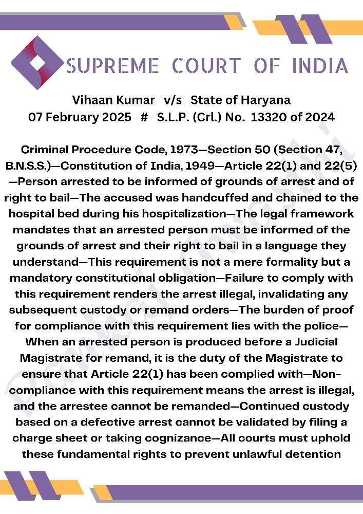 गिरफ्तार व्यक्ति को गिरफ्तारी के आधार और जमानत के अधिकार की जानकारी दी जानी चाहिए—गिरफ्तारी के दौरान व्यक्ति को अस्पताल में भर्ती होने के दौरान हथकड़ी और जंजीर से बाँधा गया—विधि के शासन में यह आवश्यक है कि गिरफ्तार व्यक्ति को गिरफ्तारी के कारणों और जमानत के अधिकार की जानकारी उनकी समझ में आने वाली भाषा में दी जाए—यह आवश्यकता केवल औपचारिकता नहीं है बल्कि एक संवैधानिक अनिवार्यता है—इस आवश्यकता का पालन न करने से गिरफ्तारी अवैध हो जाती है जिससे हिरासत या रिमांड आदेश अवैध हो जाते हैं—अनुच्छेद 22(1) के पालन हुआ या नहीं हुआ, इसका प्रमाण प्रस्तुत करने की जिम्मेदारी पुलिस पर होती है—जब किसी गिरफ्तार व्यक्ति को रिमांड के लिए न्यायिक मजिस्ट्रेट के समक्ष पेश किया जाता है तो यह मजिस्ट्रेट का कर्तव्य है कि वे सुनिश्चित करें कि अनुच्छेद 22(1) का पालन किया गया है—इस आवश्यकता का पालन न करने से गिरफ्तारी अवैध हो जाती है और गिरफ्तार व्यक्ति को रिमांड नहीं किया जा सकता है—न्यायालय द्वारा संज्ञान लेने तथा न्यायालय में चार्ज-शीतं प्रस्तुत होने से त्रुटिपूर्ण नहीं हो जाती—अवैध रिमांड/हिरासत को रोकने के लिए सभी न्यायालयों को इन मौलिक अधिकारों का संरक्षण करना चाहिए ताकि अवैध हिरासत को रोका जा सके।