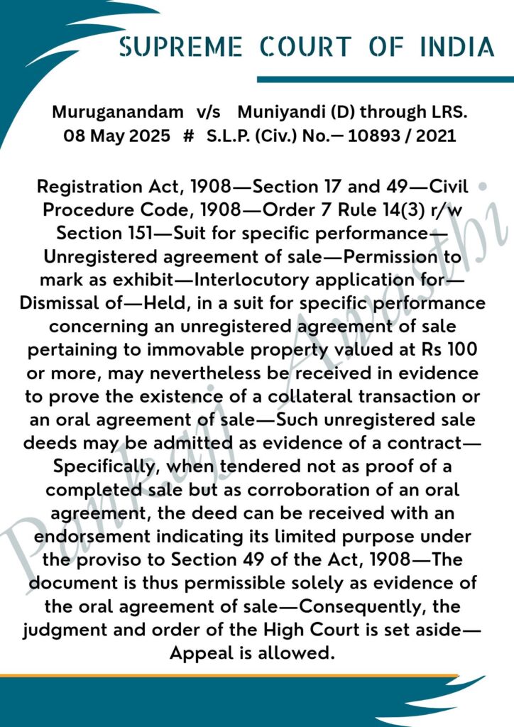 रजिस्ट्रेशन अधिनियम, 1908—धारा 17 और 49—दीवानी प्रक्रिया संहिता, 1908—आदेश 7 नियम 14(3) सहपठित धारा 151—संविदा के विशिष्ट अनुपालन हेतु वाद—गैर-पंजीकृत विक्रय अनुबंध—प्रदर्श के रूप में चिन्हित करने की अनुमति हेतु अंतरिम-आवेदन—आवेदन ख़ारिज—निर्णीत, ऐसे मामले में जहाँ निष्पादन वाद एक गैर-पंजीकृत विक्रय अनुबंध पर आधारित हो, जो रु. 100 या अधिक मूल्य की अचल संपत्ति से संबंधित हो, वह दस्तावेज फिर भी साक्ष्य में स्वीकार किया जा सकता है यदि उसका उद्देश्य किसी सहवर्ती लेन-देन (collateral transaction) या मौखिक विक्रय अनुबंध के अस्तित्व को प्रमाणित करना हो—ऐसे गैर-पंजीकृत विक्रय विलेखों को अनुबंध के प्रमाण के रूप में साक्ष्य में स्वीकार किया जा सकता है—विशेष रूप से तब जब उन्हें पूर्ण विक्रय का प्रमाण नहीं बल्कि मौखिक अनुबंध की पुष्टि हेतु प्रस्तुत किया गया हो—इस स्थिति में विलेख को उसकी सीमित प्रयोजन के लिए धारा 49 के प्रावधान (proviso) के अंतर्गत एक उल्लेख (endorsement) के साथ साक्ष्य में स्वीकार किया जा सकता है—अतः, दस्तावेज केवल मौखिक विक्रय अनुबंध के साक्ष्य के रूप में स्वीकार्य होगा—परिणामस्वरूप, उच्च न्यायालय का निर्णय और आदेश निरस्त किया जाता है—अपील स्वीकार की जाती है।