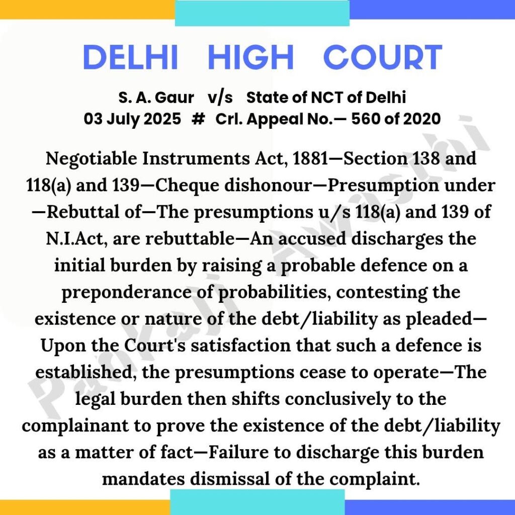 चैक अनादरण—उपधारणा—खंडन—धारा 118(क) एवं 139, एन०आई० एक्ट के अंतर्गत उत्पन्न विधिक उपधारणाएं खंडनीय होती हैं—अभियुक्त प्रारंभिक दायित्व का निर्वहन इस प्रकार कर सकता है जब वह संभावनाओं की प्रबलता (preponderance of probabilities) के आधार पर यह दर्शा दे कि उसके ऊपर परिवादी द्वारा दिया गया ऋण या देयता बकाया नहीं है—यदि न्यायालय इस निष्कर्ष पर पहुँचता है कि अभियुक्त द्वारा प्रस्तुत बचाव प्रथम दृष्टया संभाव्य है, तो अभियुक्त के विरुद्ध उक्त धाराओं के अंतर्गत प्रदत्त उपधारणा समाप्त हो जाती है—इसके पश्चात कानूनी दायित्व पूर्ण रूप से परिवादी (शिकायतकर्ता) पर आ जाता है कि वह यह तथ्यतः सिद्ध करे कि संबंधित ऋण/देयता वास्तविकता में बकाया है—यदि परिवादी ऋण के दायित्व को सिद्ध करने में विफल रहता है तो ऐसे प्रकरण में परिवाद का खारिज किया जाना अनिवार्य हो जाता है।