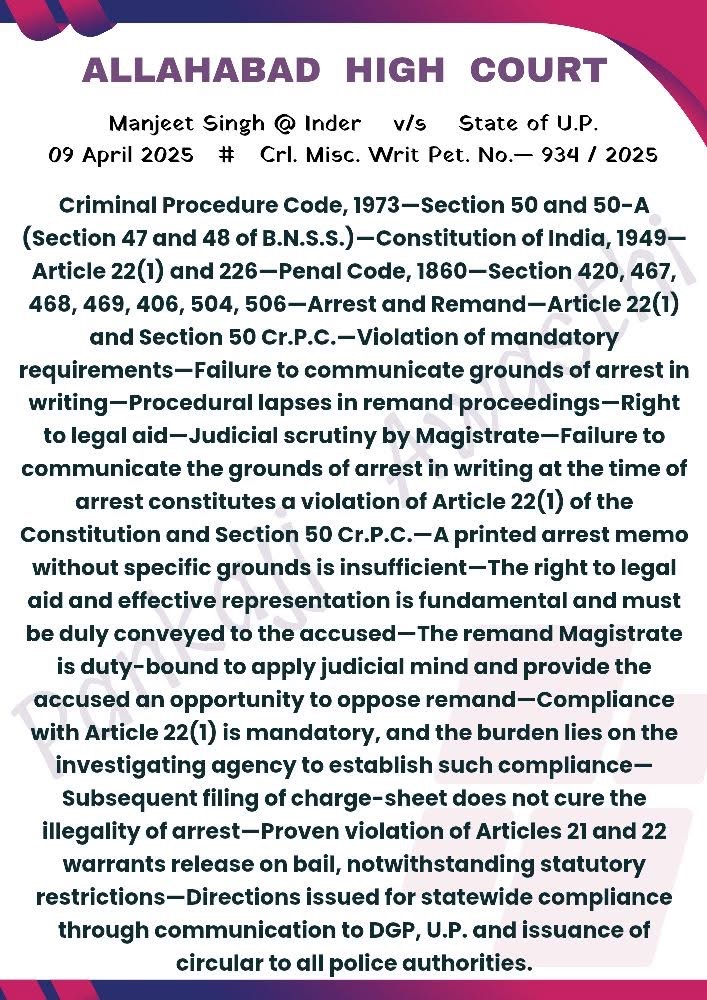 गिरफ्तारी एवं रिमांड— संवैधानिक सुरक्षा के अधिकार—अनुच्छेद 22(1) एवं दण्ड प्रक्रिया संहिता की धारा 50—अनिवार्य प्रावधानों का उल्लंघन—गिरफ्तारी के कारणों को लिखित रूप में न बताना—रिमांड कार्यवाही में प्रक्रियागत चूक—विधिक सहायता का अधिकार—मजिस्ट्रेट द्वारा न्यायिक परीक्षण—गिरफ्तारी के समय गिरफ्तारी के कारणों को लिखित रूप में न बताना संविधान के अनुच्छेद 22(1) तथा दण्ड प्रक्रिया संहिता की धारा 50 का स्पष्ट उल्लंघन है—केवल प्रिंटेड प्रारूप में गिरफ्तारी ज्ञापन (अरेस्ट मेमो) प्रदान किया जाना जिसमें विशिष्ट कारणों का उल्लेख न हो, विधिक दृष्टि से अपर्याप्त है—कानूनी सहायता का अधिकार एक मौलिक अधिकार है जिसकी जानकारी आरोपी को दी जानी अनिवार्य है—रिमांड मजिस्ट्रेट का कर्तव्य है कि वह प्रकरण में न्यायिक मस्तिष्क (judicial mind) का प्रयोग करे तथा आरोपी को रिमांड का विरोध करने का उचित अवसर प्रदान करे—अनुच्छेद 22(1) के अनुपालन की जिम्मेदारी जाँच एजेंसी पर होती है जिसे वह प्रमाणित करने के लिए बाध्य है—गिरफ्तारी के पश्चात चार्जशीट का दाखिल किया जाना गिरफ्तारी में हुई अवैधानिकता को वैध नहीं बना सकता—जब गिरफ्तारी के दौरान अनुच्छेद 21 और 22 का उल्लंघन प्रमाणित हो जाता है तो ऐसे मामलों में वैधानिक प्रतिबंधों के बावजूद आरोपी को जमानत पर रिहा किया जाना न्यायसंगत है—उत्तर प्रदेश राज्य में अनुपालन सुनिश्चित करने हेतु उत्तर प्रदेश के पुलिस महानिदेशक (DGP) को निर्देश जारी किए जाते हैं—साथ ही सभी पुलिस अधिकारियों को परिपत्र (सर्कुलर) निर्गत किया जाए जिससे उपर्युक्त संवैधानिक एवं विधिक प्रावधानों का कड़ाई से पालन सुनिश्चित हो सके।