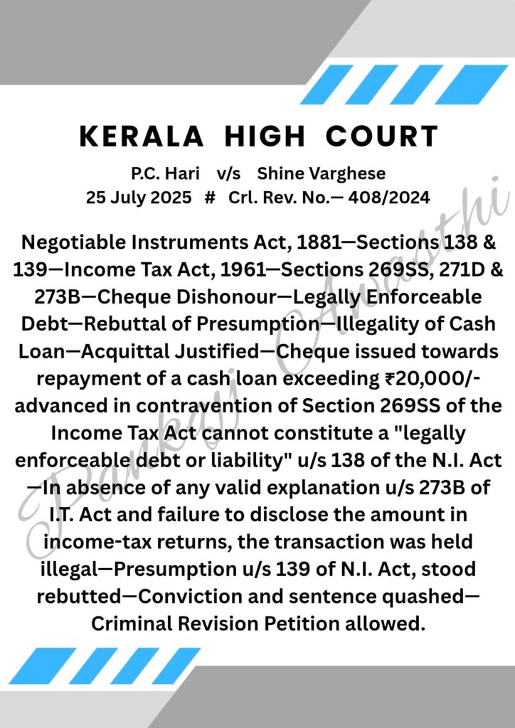 20,000/- रु० से अधिक की नकद ऋण राशि, जो आयकर अधिनियम की धारा 269SS का उल्लंघन करते हुए दी गई हो, उसकी वापसी हेतु जारी किया गया चेक परक्राम्य लिखत अधिनियम की धारा 138 के अंतर्गत “विधिक रूप से देय ऋण या दायित्व” की श्रेणी में नहीं आता—जब उक्त लेन-देन के संबंध में शिकायतकर्ता द्वारा आयकर अधिनियम की धारा 273B के तहत कोई संतोषजनक स्पष्टीकरण नहीं दिया गया और न ही उक्त राशि को आयकर विवरणी में प्रदर्शित किया गया तब ऐसा लेन-देन को अवैध होता है—पराक्रम्य लिखत अधिनियम की धारा 139 के तहत उपलब्ध उपधारणा को खंडित माना गया—परिणामस्वरूप अभियुक्त की दोषसिद्धि एवं दंड को निरस्त कर दिया गया—पुनरीक्षण याचिका स्वीकार की जाती है।