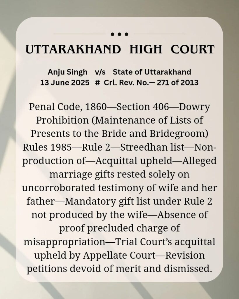 स्त्रीधन सूची—अदालत में प्रस्तुत न किए जाने पर दोष-मुक्ति का आदेश बरकरार—विवाह के समय दिए गए कथित उपहार मात्र पत्नी तथा उसके पिता के अप्रमाणित कथनों पर आधारित पाए गए—नियम 2 के अंतर्गत आवश्यक उपहार सूची पत्नी द्वारा प्रस्तुत नहीं की गई—प्रमाण के अभाव में गबन/दुर्विनियोग (Misappropriation) का आरोप सिद्ध नहीं हो सका—न्यायालय द्वारा पारित निर्दोषीकरण आदेश को अपीलीय न्यायालय ने भी यथावत् बनाए रखा—दोनों पुनरीक्षण याचिकाएँ निराधार—अतः खारिज की जाती हैं