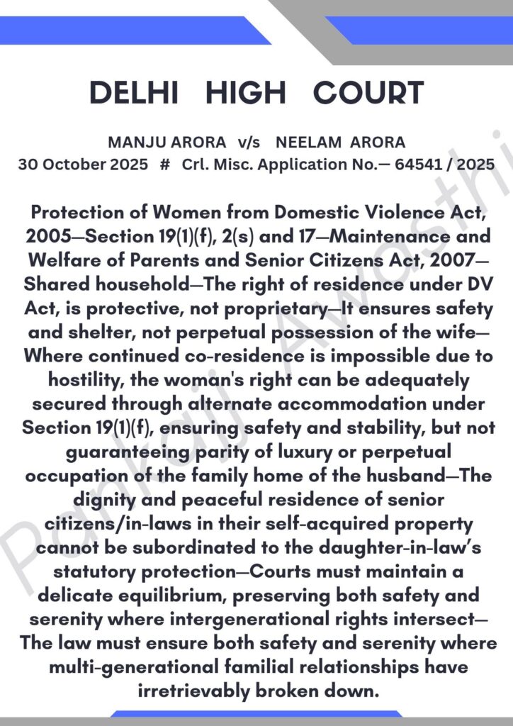 घरेलू हिंसा से महिलाओं संरक्षण अधिनियम, 2005 की धारा 19(1)(f), 2(s) एवं 17—माता-पिता एवं वरिष्ठ नागरिकों का कल्याण एवं भरण-पोषण अधिनियम, 2007—साझा-गृहस्थी—घरेलू हिंसा से संरक्षण अधिनियम, 2005 के अंतर्गत प्रदत्त निवास का अधिकार (Right of Residence) एक संरक्षणात्मक अधिकार है न कि स्वामित्वाधारित अधिकार—इस अधिनियम का उद्देश्य स्त्री को सुरक्षा एवं आश्रय प्रदान करना है न कि पति या ससुराल पक्ष की स्व- अर्जित संपत्ति पर स्थायी रूप से कब्ज़ा करवाना—जहाँ पति-पत्नी अथवा परिवारजनों के मध्य सह-निवास शत्रुता या असहनीय परिस्थितियों के कारण व्यावहारिक रूप से असंभव हो गया हो, वहाँ स्त्री के निवास अधिकार की पर्याप्त सुरक्षा धारा 19(1)(f) के अंतर्गत वैकल्पिक-आवास की व्यवस्था द्वारा की जा सकती है—यह व्यवस्था स्त्री की सुरक्षा और स्थायित्व सुनिश्चित करती है परंतु यह न तो समान भौतिक विलासिता की गारंटी देती है और न ही पति के पारिवारिक आवास में स्थायी निवास का अधिकार प्रदान करती है—इसके अतिरिक्त, वरिष्ठ नागरिकों अथवा सास्-ससुर के अपनी स्व-अर्जित संपत्ति में गरिमा और शांति से निवास करने के अधिकार को बहू के अधिकारों द्वारा समाप्त नहीं किया जा सकता—अतः न्यायालयों का दायित्व है कि वे इस प्रकार के अंतर-पीढ़ीगत अधिकारों (intergenerational rights) के टकराव में संतुलन एवं समरसता बनाए रखें—ताकि स्त्री की सुरक्षा और वरिष्ठजनों की शांति एवं गरिमा—दोनों का संरक्षण हो सके—विधि का उद्देश्य केवल सुरक्षा नहीं, बल्कि ऐसी स्थिति का निर्माण करना है जहाँ सुरक्षा और शांति दोनों का समन्वय संभव हो, विशेषतः तब जब बहु-पीढ़ीय पारिवारिक संबंध अपरिवर्तनीय रूप से विच्छिन्न हो चुके हों।