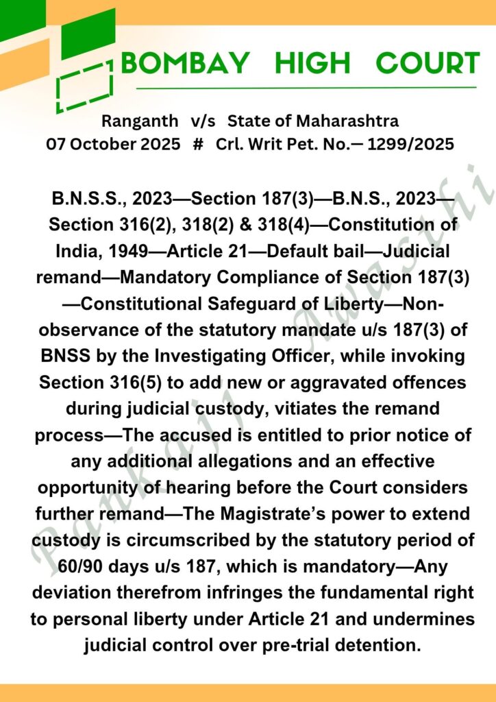 डिफ़ॉल्ट ज़मानत—न्यायिक रिमांड—धारा 187(3) के आज्ञापक प्रावधान का अनुपालन—स्वतंत्रता का संवैधानिक संरक्षण—जाँच अधिकारी द्वारा न्यायिक-अभिरक्षा के दौरान धारा 316(5) का प्रयोग करते हुए नए या अधिक गंभीर अपराध जोड़े जाने पर यदि धारा 187(3) बी.एन.एस.एस. के वैधानिक प्रावधान का अनुपालन नहीं किया गया है तो ऐसी रिमांड की प्रक्रिया अवैध (vitiated) मानी जाएगी—आरोपी को किसी भी अतिरिक्त आरोप की सूचना (prior notice) पूर्व में दी जानी आवश्यक है तथा न्यायालय के समक्ष आगे की रिमांड पर विचार करने से पूर्व उसे प्रभावी रूप से सुनवाई (effective opportunity of hearing) का अवसर प्रदान किया जाना अनिवार्य है—न्यायिक मजिस्ट्रेट की अभिरक्षा बढ़ाने की शक्ति धारा 187 के तहत निर्धारित 60/90 दिनों की वैधानिक अवधि तक ही सीमित है, जो कि अनिवार्य है—इस अवधि से कोई भी विचलन (deviation) आरोपी के अनुच्छेद 21 के तहत प्रदत्त व्यक्तिगत स्वतंत्रता के मौलिक अधिकार का उल्लंघन करता है तथा पूर्व-विचारण (pre-trial) निरोध पर न्यायिक नियंत्रण को कमजोर करता है।