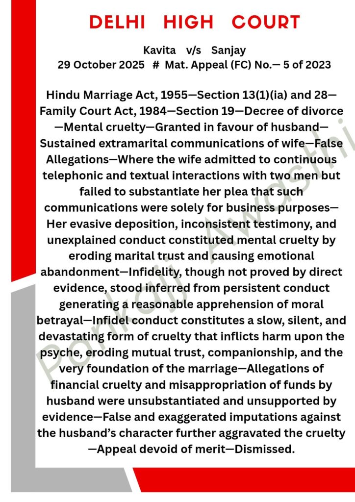 विवाह विच्छेद की डिक्री—मानसिक क्रूरता—पति के पक्ष में पारित—पत्नी के निरन्तर परपुरुष से संपर्क—जहाँ पत्नी ने दो व्यक्तियों के साथ निरंतर टेलीफोनिक एवं संदेशात्मक संवाद बनाए रखने की बात स्वीकार की, परंतु वह यह सिद्ध करने में असफल रही कि उक्त संवाद केवल व्यावसायिक प्रयोजन हेतु थे—पत्नी की टालमटोल भरी गवाही, असंगत कथन तथा अस्पष्ट आचरण ने वैवाहिक विश्वास को नष्ट कर मानसिक क्रूरता गठित की, जिससे पति को भावनात्मक परित्याग का अनुभव हुआ—यद्यपि व्यभिचार का प्रत्यक्ष प्रमाण नहीं था, तथापि पत्नी के निरंतर आचरण से नैतिक विश्वासघात की युक्तियुक्त आशंका उत्पन्न हुई—ऐसा अविश्वासी आचरण मानसिक क्रूरता का मूक, धीमा किंतु विनाशकारी स्वरूप है जो दाम्पत्य संबंधों की नींव, पारस्परिक विश्वास एवं सहचर्य को अंदरूनी रूप से नष्ट करता है—पति पर वित्तीय क्रूरता अथवा धन के दुरुपयोग के आरोप प्रमाणरहित और अविश्वसनीय पाए गए—पति के चरित्र के विरुद्ध झूठे एवं अतिरंजित आरोप लगाना भी क्रूरता को और गंभीर बनाता है—अपील निराधार पाई गई—अतः खारिज।