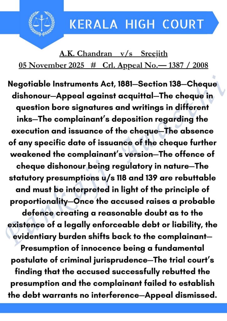 चेक अनादरण—दोष-मुक्ति के विरुद्ध अपील—विवादित चेक पर हस्ताक्षर एवं लेखन दोनों ही भिन्न-भिन्न स्याही से किए गए थे—शिकायतकर्ता के बयान में चेक के निष्पादन के संबंध में असंगति पाई गई—चेक के निर्गमन की किसी विशिष्ट तिथि के अभाव ने शिकायतकर्ता के मामले को और अधिक दुर्बल बना दिया—चेक अनादरण का अपराध अपनी प्रकृति में नियामक होते हुए, परक्राम्य लिखत अधिनियम की धारा 118 एवं 139 के अधीन प्रदत्त वैधानिक उपधारणाओं को अभिखण्डित (rebut) किया जा सकता है, और इनका अर्थान्वयन समानुपातिकता के सिद्धांत (principle of proportionality) के आलोक में किया जाना चाहिए—जब अभियुक्त ऐसा संभाव्य प्रतिरक्षा (probable defence) प्रस्तुत करता है जिससे विधिक रूप से प्रवर्तनीय देयता अथवा ऋण (legally enforceable debt or liability) के अस्तित्व पर युक्तिसंगत संदेह उत्पन्न होता है, तब सिद्ध करने का भार पुनः शिकायतकर्ता पर स्थानांतरित हो जाता है—निर्दोषता का अनुमान (presumption of innocence) आपराधिक न्यायशास्त्र का मूल सिद्धांत है—अतः जब विचारण न्यायालय ने यह पाया कि अभियुक्त ने अनुमानों को सफलतापूर्वक खंडित कर दिया तथा शिकायतकर्ता ऋण या देयता सिद्ध करने में असफल रहा, तो उस निर्णय में हस्तक्षेप का कोई औचित्य नहीं है—अपील निरस्त।