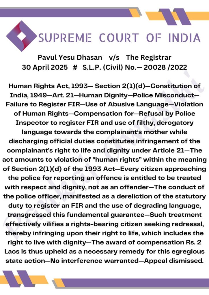 मानव अधिकार उल्लंघन—मानव गरिमा—पुलिस का दुराचरण—प्राथमिकी दर्ज न करना व अभद्र भाषा का प्रयोग— क्षतिपूर्ति प्रदान किए जाने के आदेश की वैधता—पुलिस निरीक्षक द्वारा प्रथम सूचना रिपोर्ट दर्ज करने से इंकार करना तथा शिकायतकर्ता की माता के प्रति अपने राजकीय कर्तव्यों का पालन करते हुए अशोभनीय, अपमानजनक एवं असभ्य भाषा का प्रयोग करना भारतीय संविधान के अनुच्छेद 21 के अंतर्गत शिकायतकर्ता के जीवन और गरिमा के अधिकार का उल्लंघन है—यह कृत्य मानवाधिकार संरक्षण अधिनियम, 1993 की धारा 2(1)(d) के अर्थ में “मानवाधिकारों के उल्लंघन” की श्रेणी में भी आता है—हर नागरिक, जो किसी अपराध की सूचना देने अथवा शिकायत दर्ज कराने के लिए पुलिस के समक्ष जाता है उसे एक अपराधी के समान नहीं बल्कि सम्मान और गरिमा के साथ व्यवहार किए जाने का अधिकार है—पुलिस अधिकारी का ऐसा आचरण, जो प्रथम सूचना रिपोर्ट दर्ज करने जैसे वैधानिक दायित्व से विमुख हो और साथ ही अपमानजनक भाषा का प्रयोग करे, नागरिक के मौलिक अधिकारों का स्पष्ट अतिक्रमण है—ऐसा व्यवहार, न्याय की माँग करने वाले एक अधिकार-संपन्न नागरिक का अवमूल्यन करता है और उसके जीवन जीने के अधिकार , जिसमें गरिमा के साथ जीवन यापन का अधिकार निहित है, का हनन करता है—अतः राज्य आयोग द्वारा शिकायतकर्ता को ₹2,00,000/- (दो लाख रुपये) की क्षतिपूर्ति प्रदान करने का आदेश उचित एवं न्यायोचित है—अपील खारिज की जाती है।