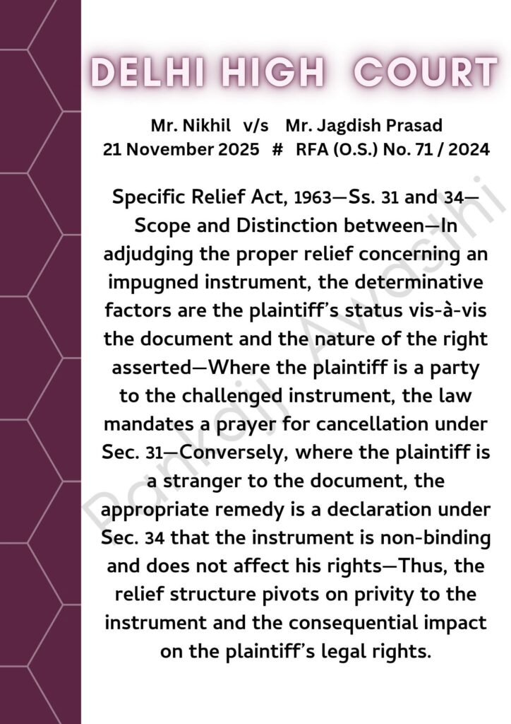 विनिर्दिष्ट अनुतोष अधिनियम, 1963—धारा 31 व 34—दोनों विधिक प्रावधानों में अन्तर—संविदा के अनुपालन में विवादित दस्तावेज़ के संबंध में उपयुक्त राहत निर्धारित करते समय वादी की स्थिति तथा उसके द्वारा प्रतिपादित अधिकार का स्वरूप, निर्णायक तत्व होते हैं—जहाँ वादी स्वयं प्रश्नगत दस्तावेज़ का पक्षकार हो, वहाँ क़ानून धारा 31 के अंतर्गत रद्दीकरण (cancellation) की प्रार्थना को अनिवार्य ठहराता है—इसके विपरीत, जहाँ वादी उस दस्तावेज़ का पक्षकार न हो, वहाँ उपयुक्त राहत धारा 34 के अंतर्गत यह घोषणा (declaration) माँगना है कि संबंधित दस्तावेज़ उसके अधिकारों को बाधित नहीं करता और न ही उस पर प्रभाव डालता है।